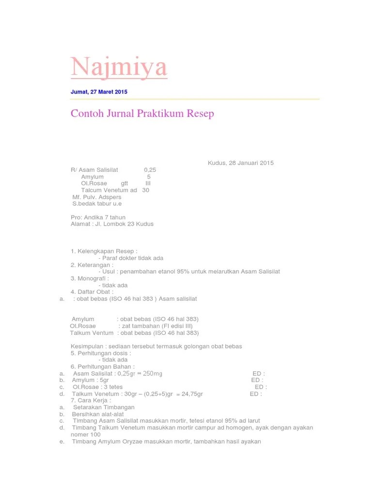 3 x 1 caps i Contoh pembuatan jurnal resep puyer. Contoh cover jurnal praktikum farmasetika i:. Inkompatibilitas, bentuk sediaan obat padat dan semi padat, serta resep. 2.dede atika smk kartrini 2017 jurnal praktikum resep dr.handoko dum 19/94 2 jl.mega mendung no.6 .